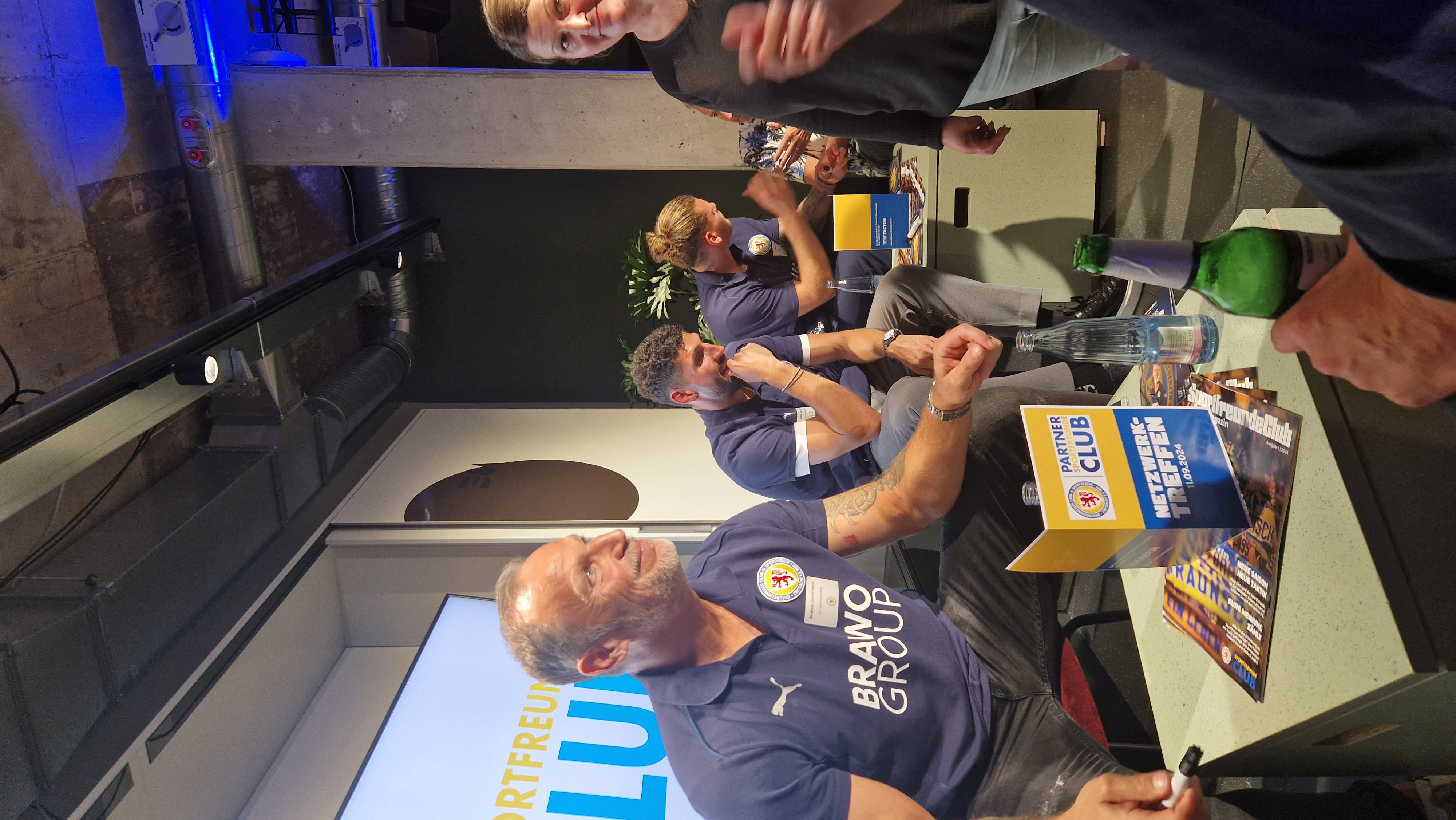 Frisch gestärkt folgte dann endlich das Highlight des Abends: eine Talk- Runde mit unseren Löwen Fabio Kaufmann, Andreas „Zimbo“ Zimmermann und Kevin Ehlers. Dabei konnten wir Eindrücke sammeln, wie das Leben als Profifußballer ist, einige Spielkniffe lernen und nicht zuletzt ein paar persönliche Dinge aus den Dreien herauskitzeln.